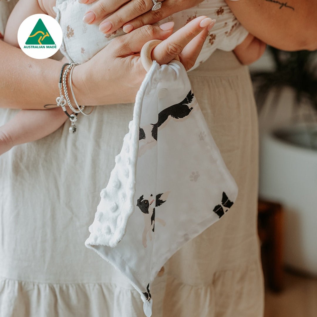 Crafted from soft jersey stretch and tactile minky dot fabric and paired with a natural beechwood teething ring, it’s lightweight, cozy, and comforting - perfect for snuggles, naps, and soothing on the go.