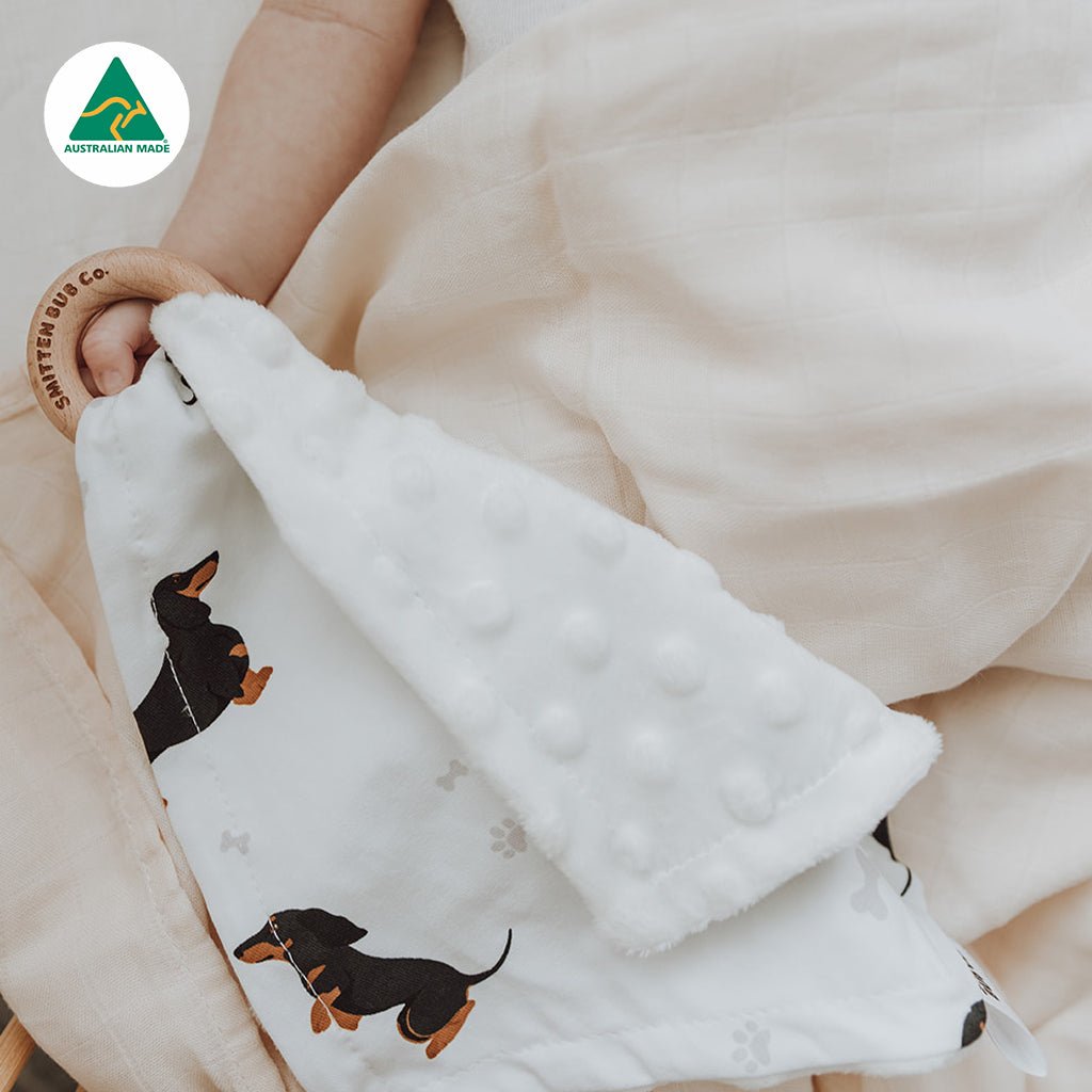 Crafted from soft jersey stretch and tactile minky dot fabric and paired with a natural beechwood teething ring, it’s lightweight, cozy, and comforting - perfect for snuggles, naps, and soothing on the go.