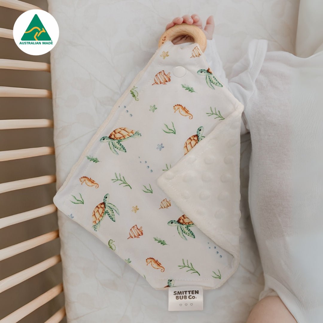 Crafted from soft jersey stretch and tactile minky dot fabric and paired with a natural beechwood teething ring, it’s lightweight, cozy, and comforting - perfect for snuggles, naps, and soothing on the go.