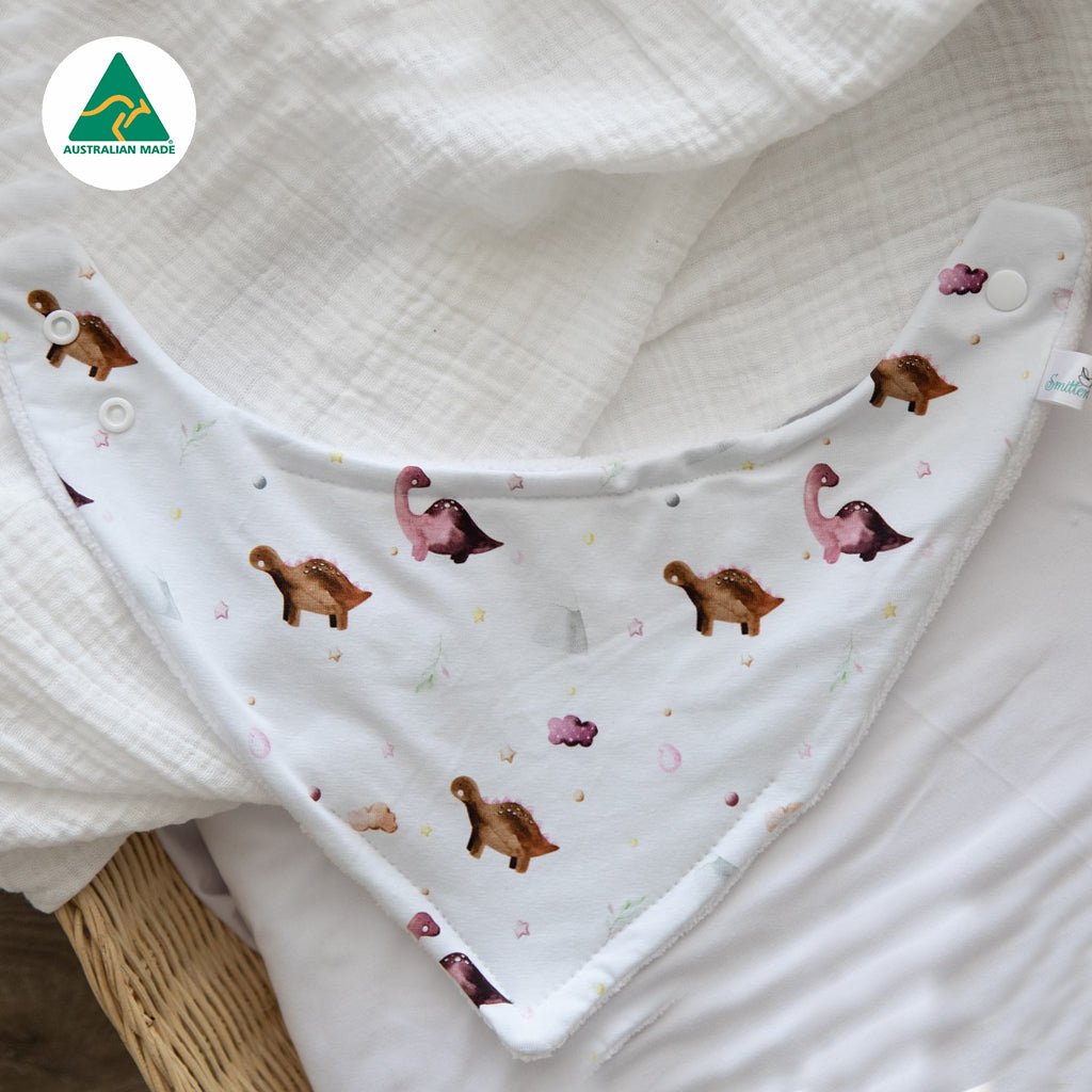 Because girls love dino's too....Our Pink Dinosaur Bib is a simple yet soft pattern of maroon, pink and brown dinosaurs dispersed with stars, volcanos and leaves.