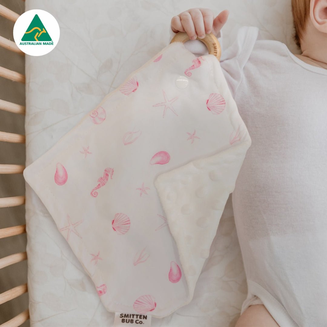 Crafted from soft jersey stretch and tactile minky dot fabric and paired with a natural beechwood teething ring, it’s lightweight, cozy, and comforting - perfect for snuggles, naps, and soothing on the go.