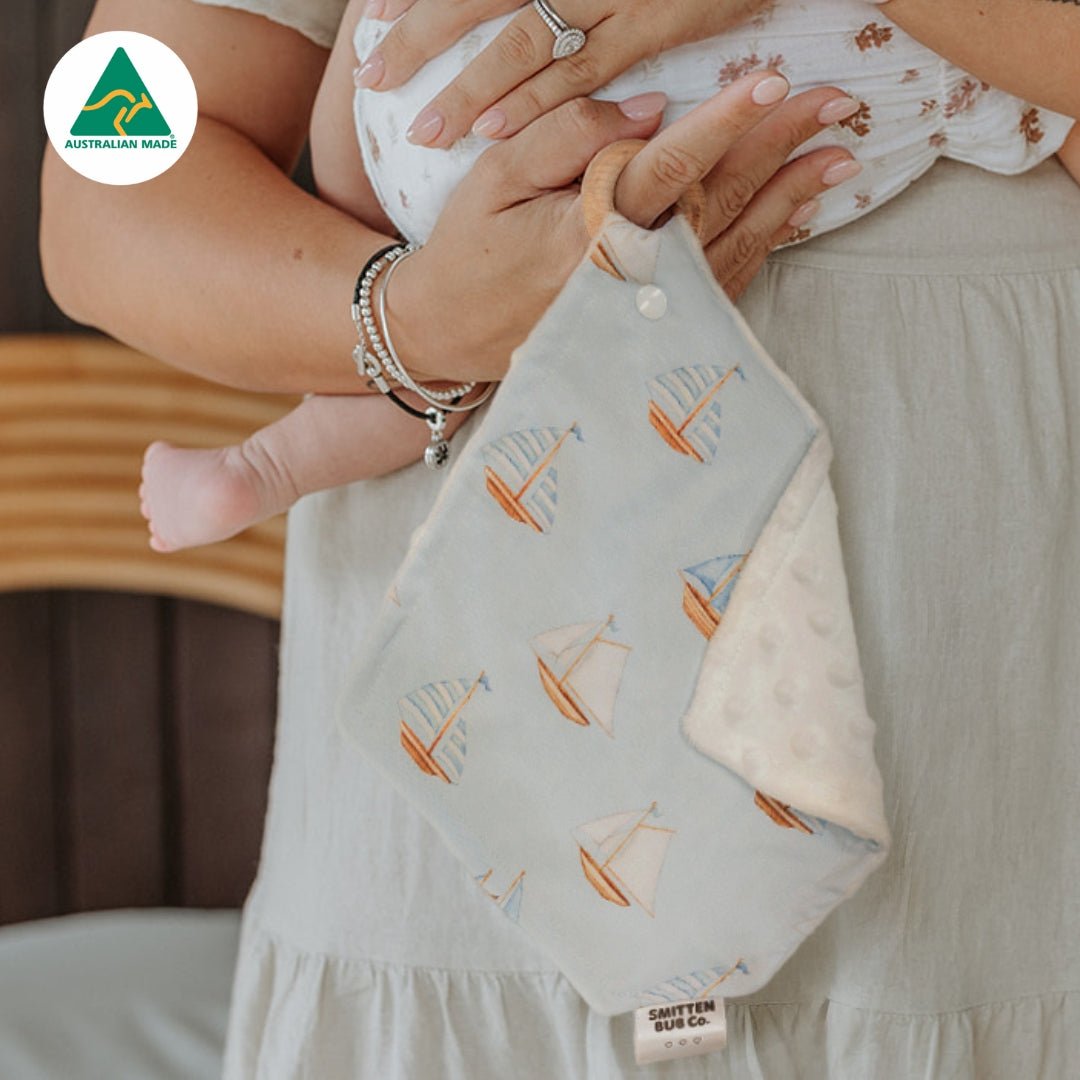 Crafted from soft jersey stretch and tactile minky dot fabric and paired with a natural beechwood teething ring, it’s lightweight, cozy, and comforting - perfect for snuggles, naps, and soothing on the go.