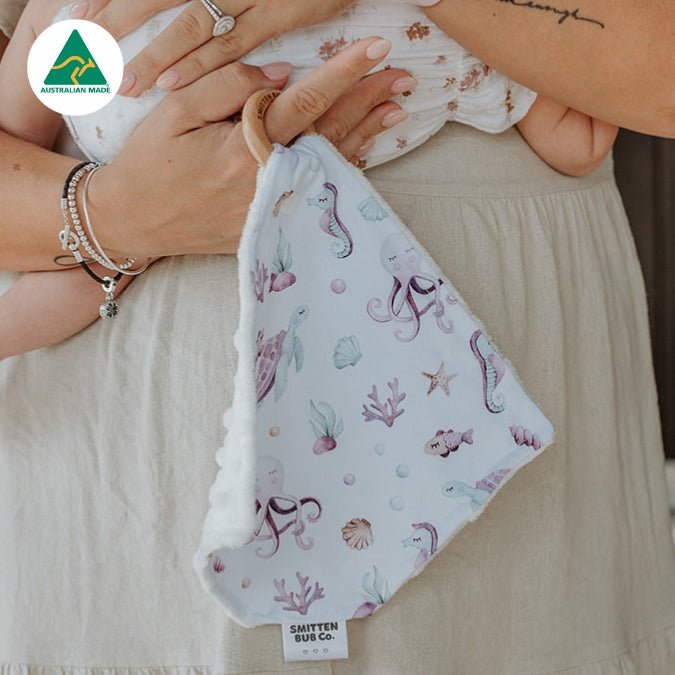 Crafted from soft jersey stretch and tactile minky dot fabric and paired with a natural beechwood teething ring, it’s lightweight, cozy, and comforting - perfect for snuggles, naps, and soothing on the go.