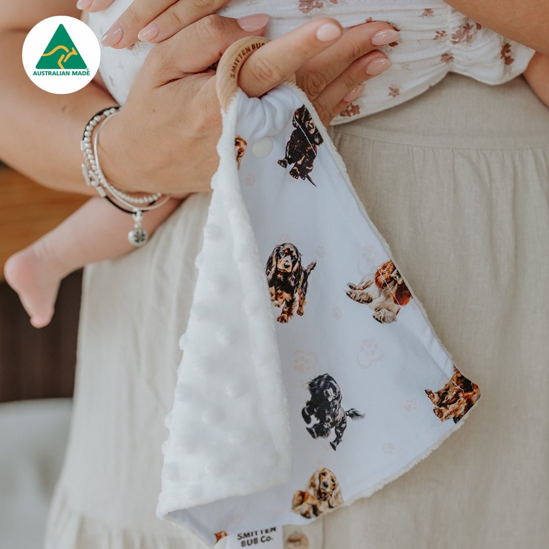 Crafted from soft jersey stretch and tactile minky dot fabric and paired with a natural beechwood teething ring, it’s lightweight, cozy, and comforting - perfect for snuggles, naps, and soothing on the go.