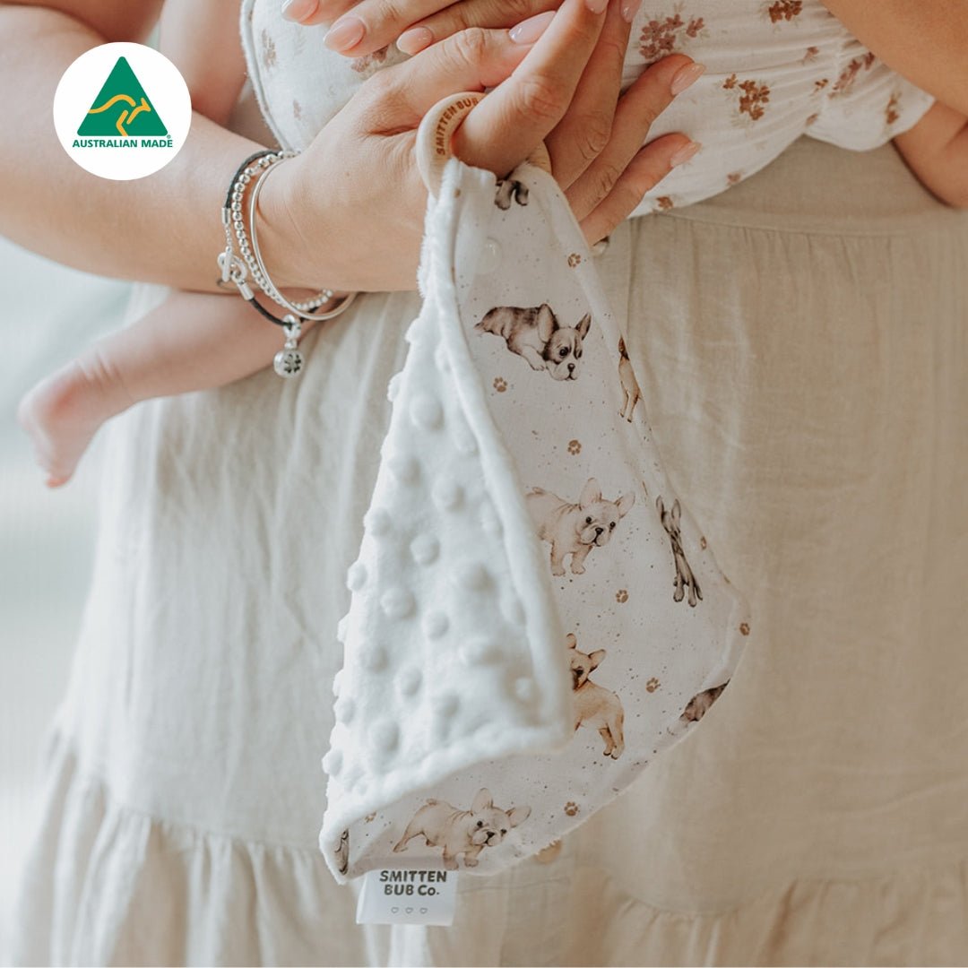 Crafted from soft jersey stretch and tactile minky dot fabric and paired with a natural beechwood teething ring, it’s lightweight, cozy, and comforting - perfect for snuggles, naps, and soothing on the go.