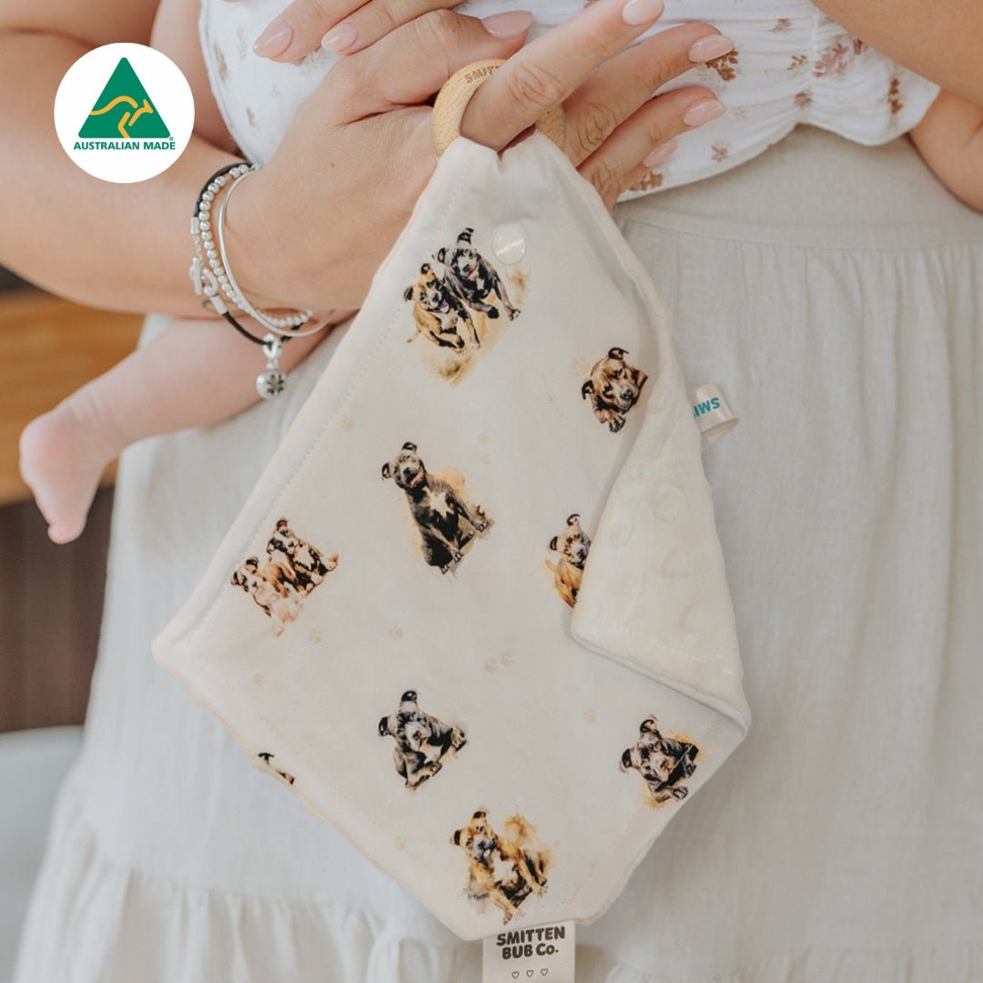 Crafted from soft jersey stretch and tactile minky dot fabric and paired with a natural beechwood teething ring, it’s lightweight, cozy, and comforting - perfect for snuggles, naps, and soothing on the go.