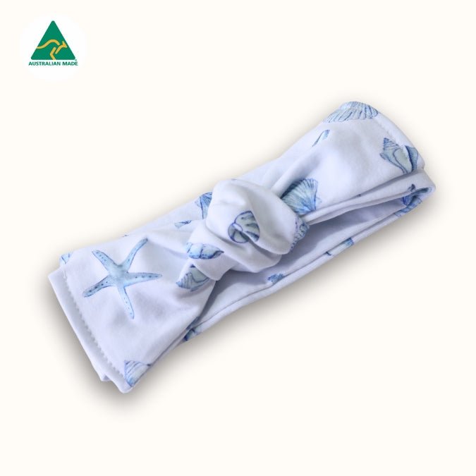 A soft off white background with a scattering of classic seashells in the perfect shade of blue for any genders.