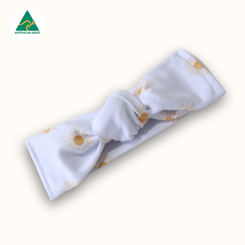 Our sun motif topknot bow features a hand-painted sun print in soft golden tones on a crisp white background.