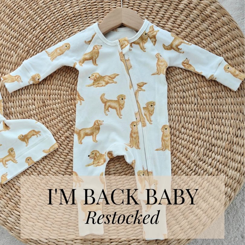 Our exclusive Golden Retriever print is now available in an all-in-one onesie.