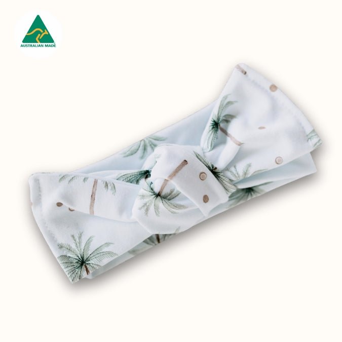 Featuring hand-painted palms and coconuts, this soft-as-a-cloud essential brings a whisper of summer to every snuggle. A soft white background with a scattering of palm trees and falling coconuts.