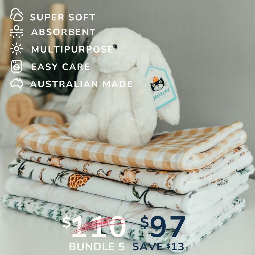 Meet the most absorbent, soft, and stylish burp cloths around - proudly made right here in Australia. A true baby essential, they’re perfectly sized for everyday use you will want to keep one on hand in your baby bag, your nappy caddy, your nursery, your bathroom...everywhere!